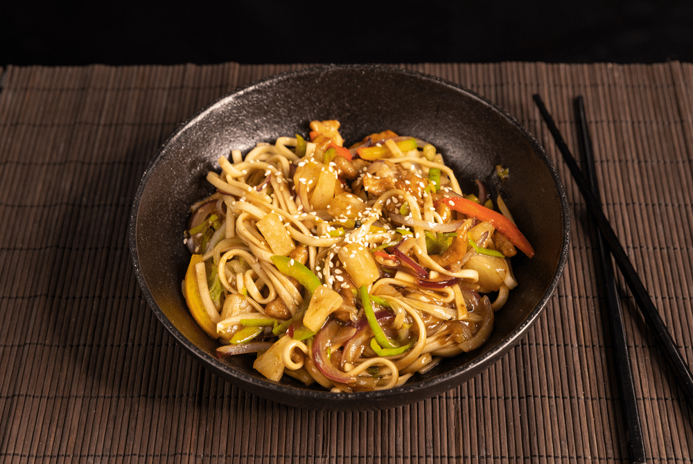 Пшеничная лапша с популярным для Азии сочетанием мяса и ананаса, дополненная овощами и обжаренная в воке с традиционным соусом.
