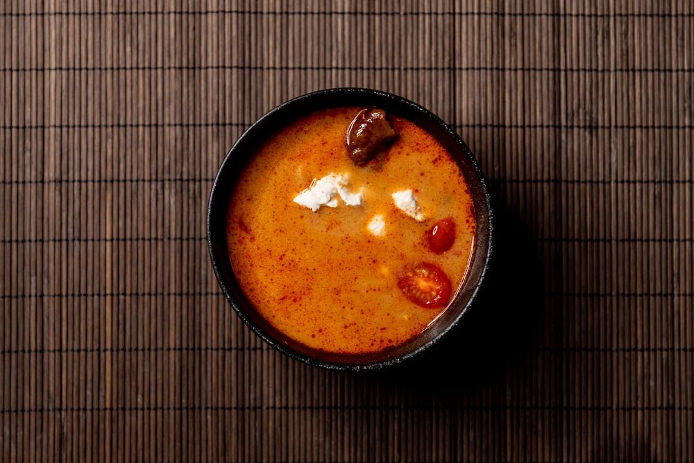 Известный паназиатский острый суп с пряно-цитрусовым вкусом, приготовленный на курином бульоне с кокосовым молоком и куриным филе.
