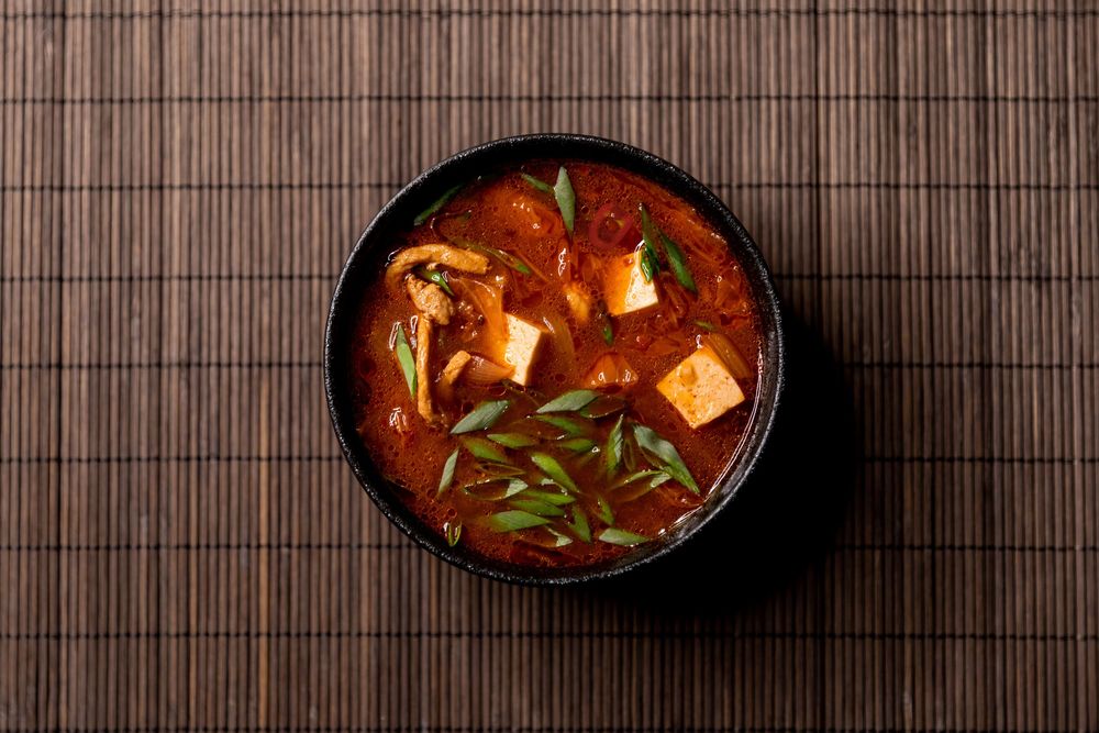 Один из самых популярных корейских супов, известный своей сильной остротой, благодаря капусте кимчи и перцовой пасте.