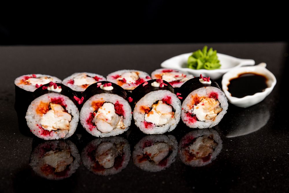 Копченый угорь и тигровая креветка, сыр и икра с нотой соуса спайси в презентабельном исполнении.