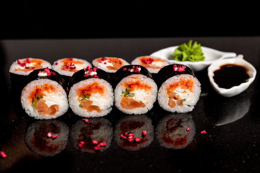 Рис, лосось с/с, лосось х/к, творожный сыр, огурец, икра масаго, майонез, нори, сублимированные ягоды(малина).