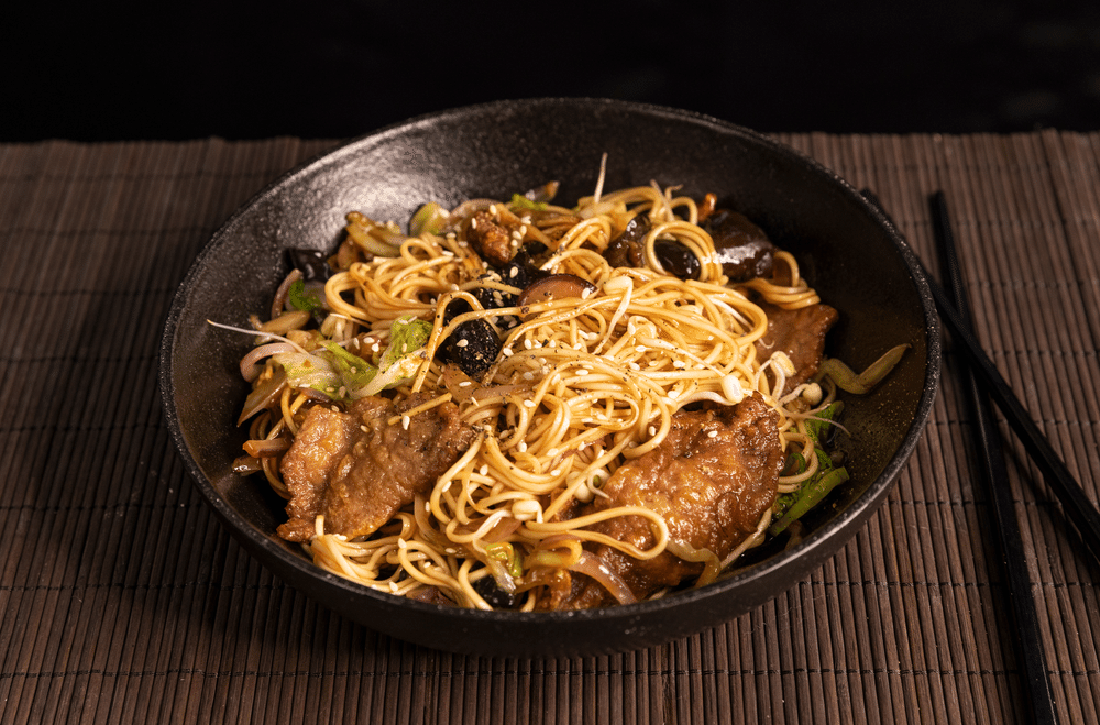 Яичная лапша со слайсами говядины в ярком, трех составном обжигающем соусе, дополненная овощами, древесными грибами и обжаренная на раскалённом воке.