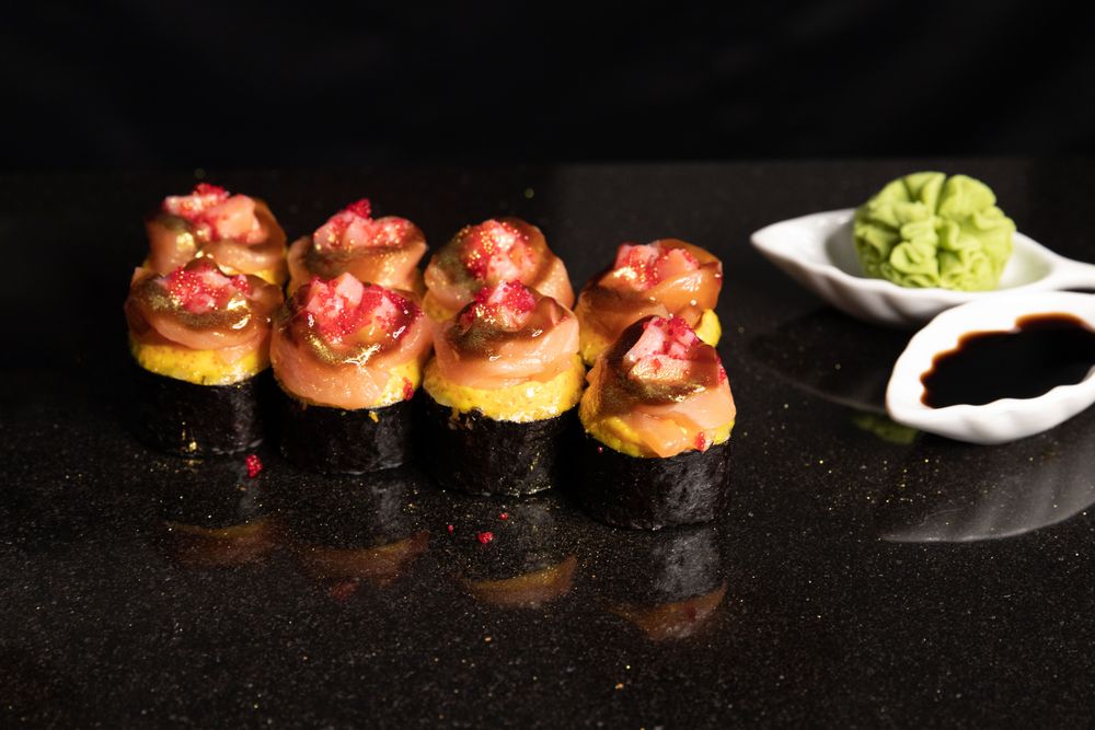 Изысканный вкус копченого угря и двух видов лосося в сочетании с нежным сыром, икрой и якитори соусом в изящном исполнении.