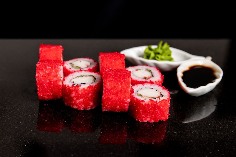 Классика с икрой, снежным крабом, майонезом и огурцом.