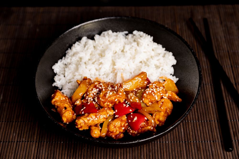 Блюдо кантонской кухни. Свинина в кисло-сладком соусе с перцем и ананасом. Подается в вок коробочке с паровым рисом.