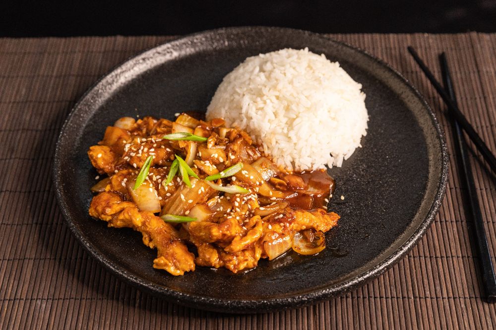 Обжаренное на воке мясо с острой капустой кимчи в корейском стиле. Подается в вок коробочке с паровым рисом.
