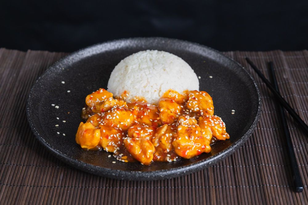 Рис паровой, куриное филе, соус сладкий чили, мука темпурная, масло растительное, бульон куриный, соус устричный, соус шрирача, крахмал кукурузный, кунжут.