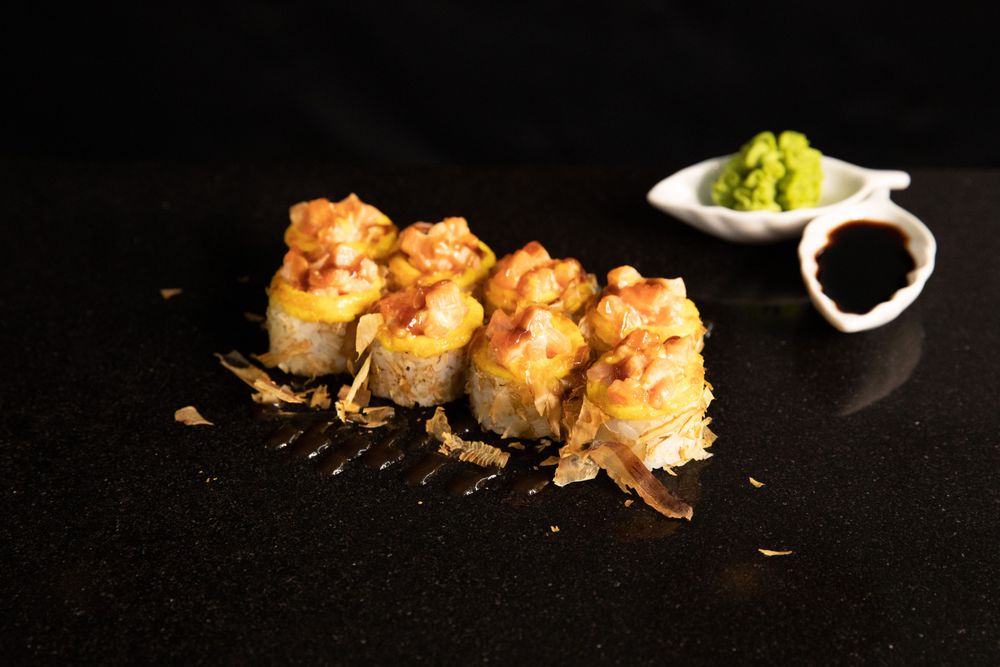 Запеченный ролл в стружке тунца с шапочкой из двух видов нежнейшего лосося.