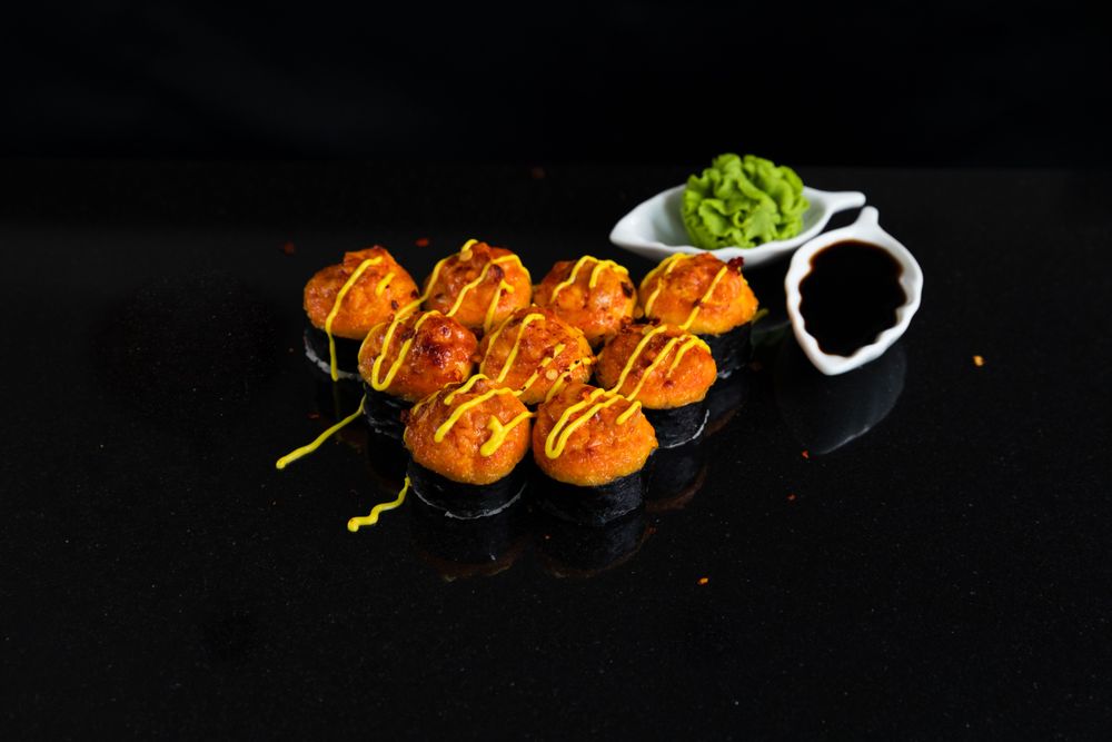 Рис, лосось с/с, творожный сыр, соус яки, огурец, спайси соус, соус шрирача, якитори соус, соус манго майо, нори, перец кочукару.