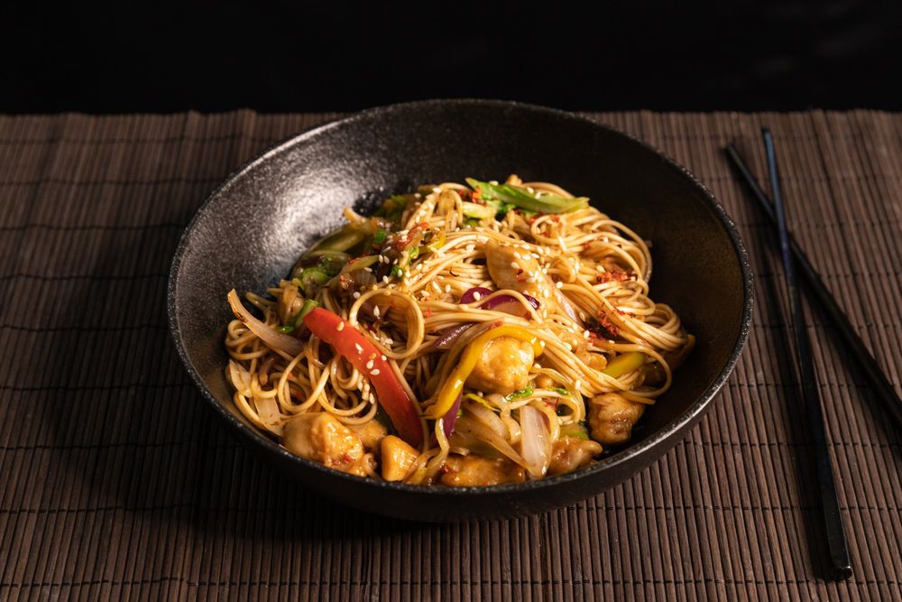 Классика стир-фрай - жареная яичная лапша с куриным филе и овощами, дополненная традиционным пряным соусом хойсин.