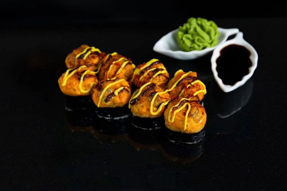 Рис, креветка салатная, копченый угорь, огурец, капуста кимчи, соус яки, соус спайси, соус якитори, соус манго майо, нори, нити чили.