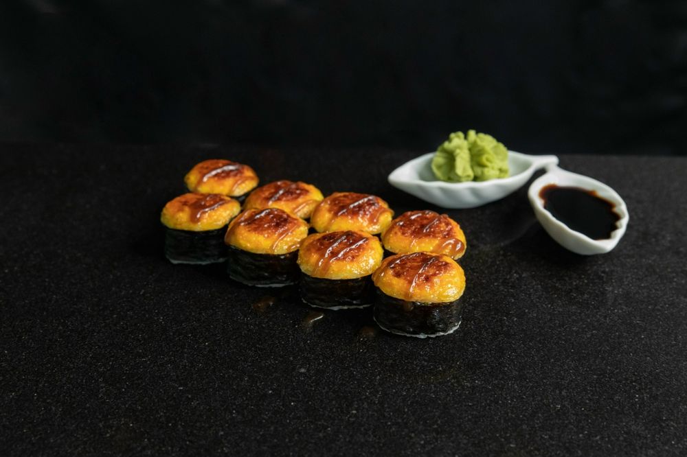 Классический запеченный ролл с имитацией краба и пикантной нотой спайси соуса.