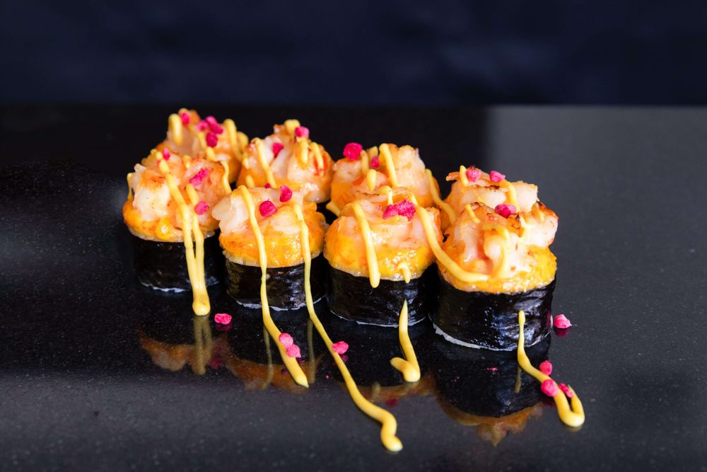 Рис, творожный сыр, креветка тигровая, огурец, соус яки, соус сладкий чили, соус манго, нори, сублимированная малина.