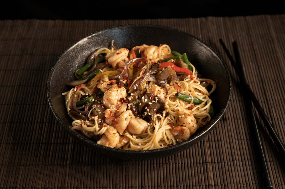 Лапша для ценителей морепродуктов, в которой сочетаются овощи, древесные гибы, трехкомпонентный соус, и, конечно, тигровая креветка, нарезанная традиционным китайским способом.