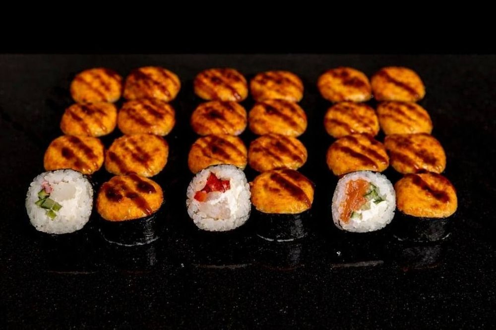 Вариация трех классических начинок с лососем, креветкой и снежным крабом, под шапочками из яки и спайси соусов.