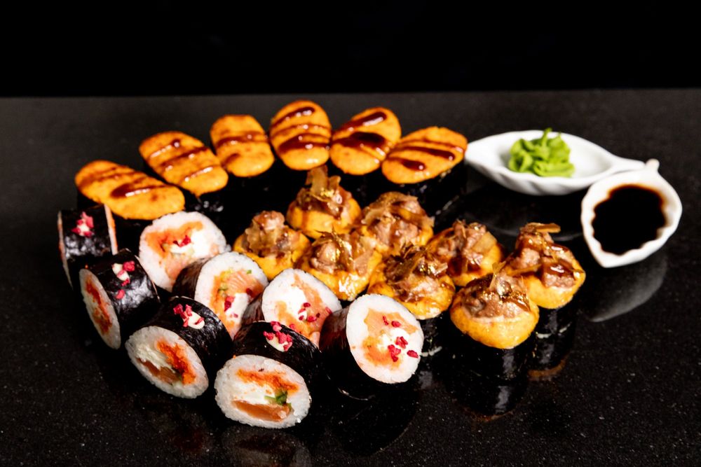 Нори, рис, творожный сыр, лосось с/с, лосось х/к, тунец, тигровая креветка, икра масаго, огурец, соус яки, соус спайси, соус якитори, соус имбирный, майонез, сублимированные ягоды(малина), стружка тунца.