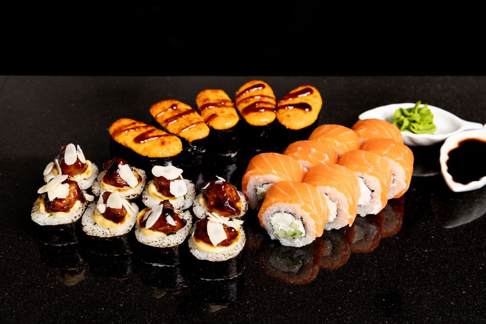 Сет из классической филадельфии и опаленным роллом с курицей якитори и миндальными лепестками. Дополняют вкусовое сочетание запеченные гунканы с салатной креветкой.