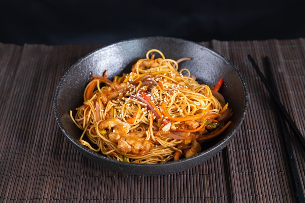 Китайская жареная лапша со свининой и овощами под комбинацией из разных соусов и перцовыми нотами.